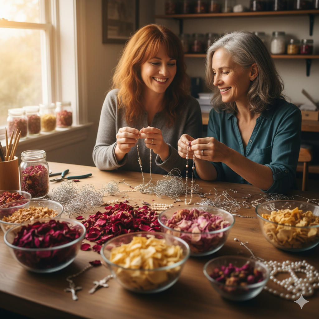 Floral Rosary was born from the close bond between two sisters, Colette and Jeanette, who wanted to share a meaningful way for families to hold onto their memories. Inspired by their shared upbringing in Catholic school and their active roles in their parish, they turned a passion for floral keepsakes into a mission to help others.